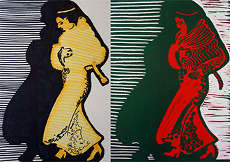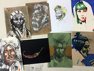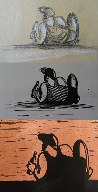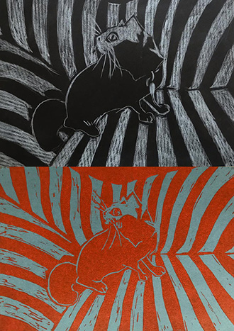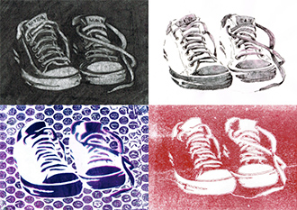 Wir erarbeiten Skizzen mit Graphit, Kohle, Farbstift, Kreide oder Tusche und bedienen uns für eine Umsetzung verschiedener Variationen der Monotypie, Cyanotypie, Schablonendruck, Linol- oder Holzschnitt sowie einfacher Siebdrucke auf Textil.